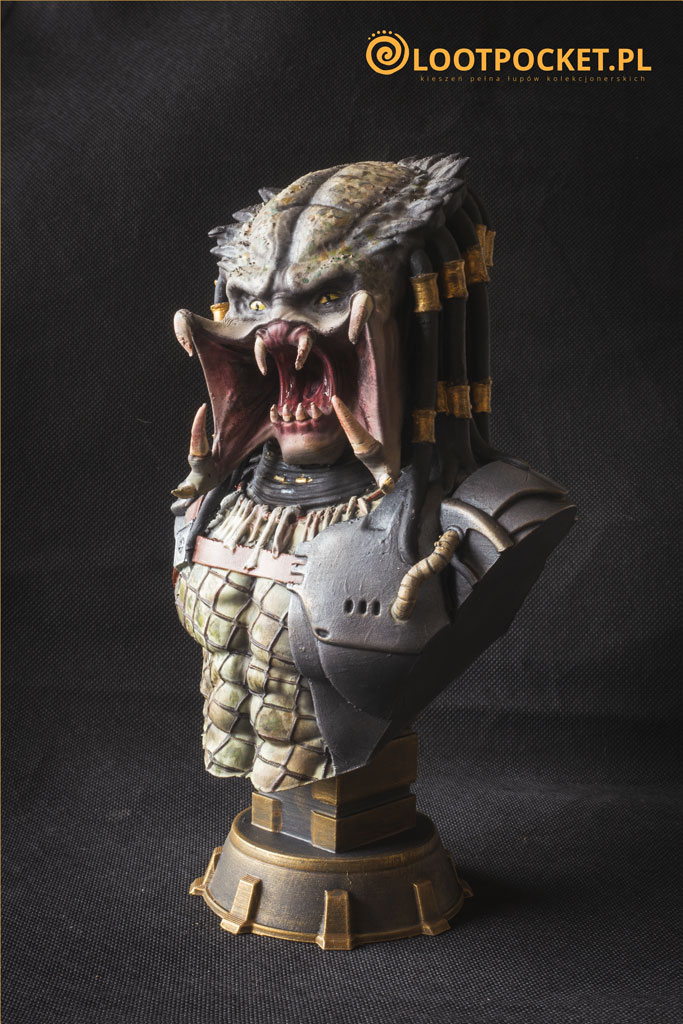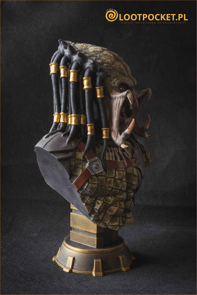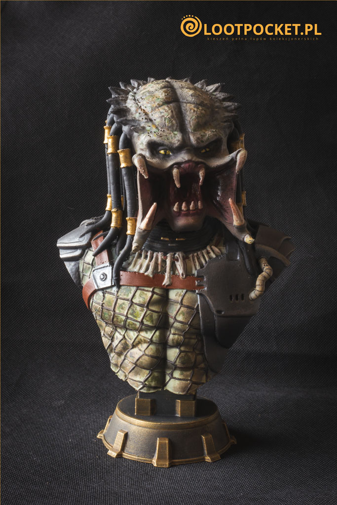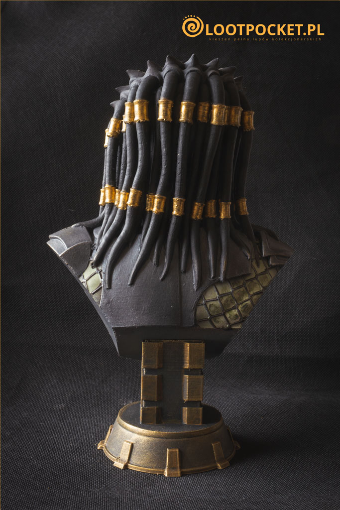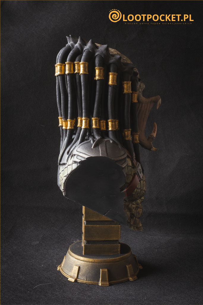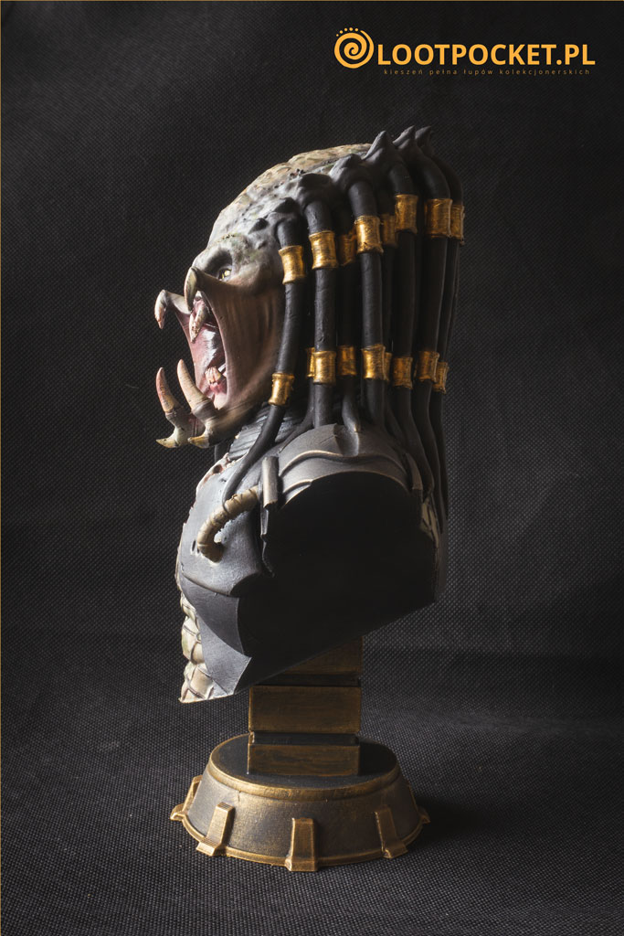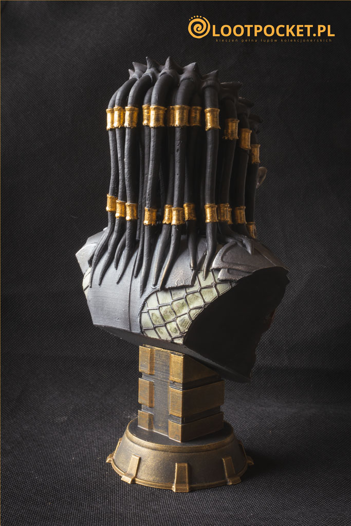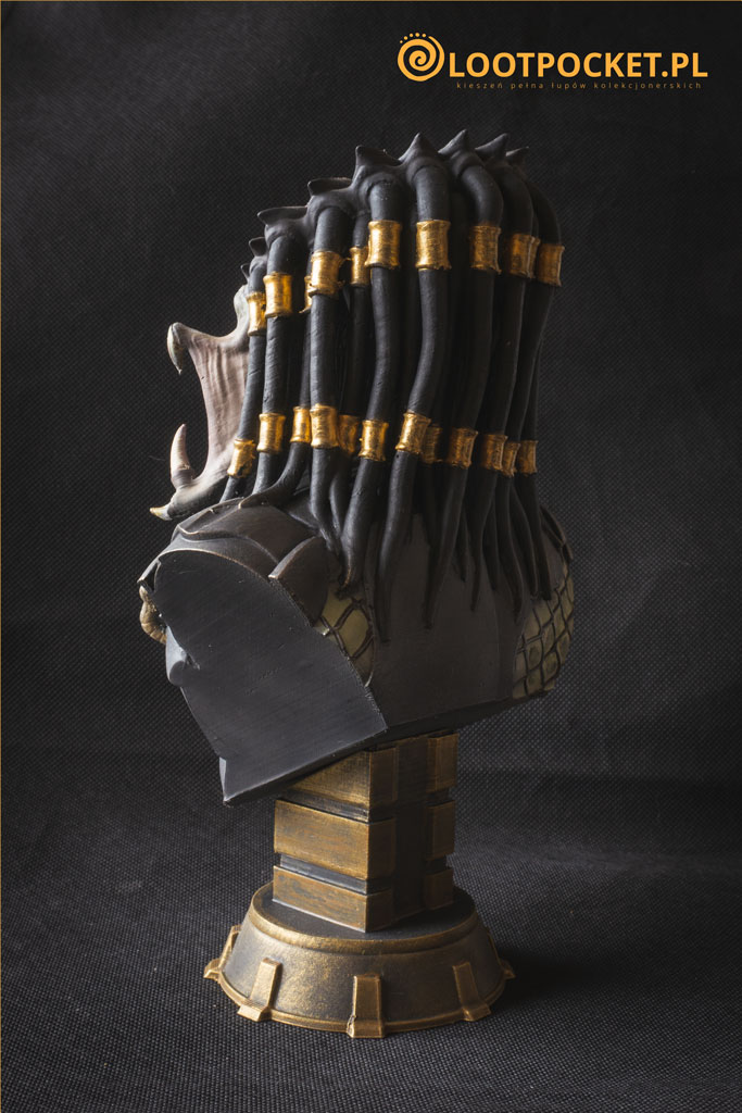 Predator Bust – ręcznie malowany druk 3D (PLA). Wysokość 22 cm, szerokość 14 cm. Detaliczna, kultowa postać z bogatą teksturą skóry i złotymi opaskami na dreadlockach. Podstawa w eleganckim, złotym/metalicznym wykończeniu. Unikatowy dodatek do każdej kolekcji fanów Predatorów.